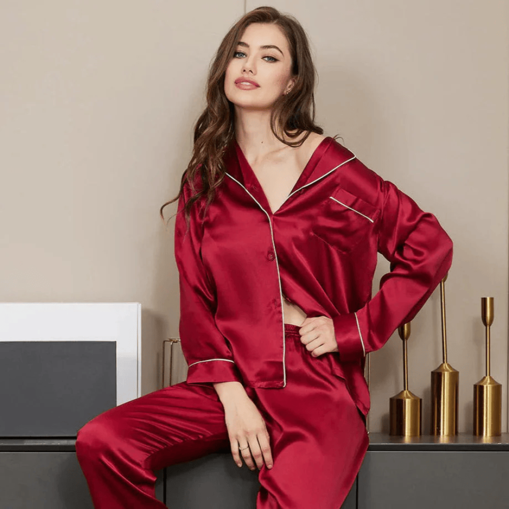 طقم بيجامات من الحرير والساتان - نبيذ أحمر + (ربطة شعر مجانية)